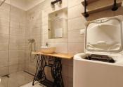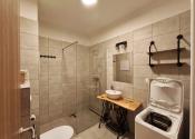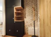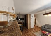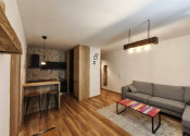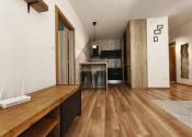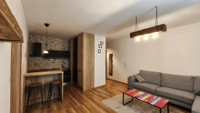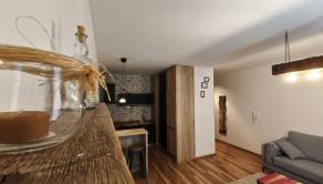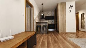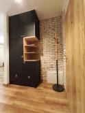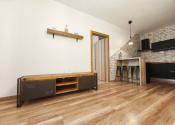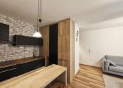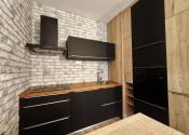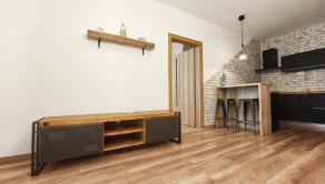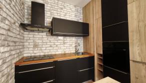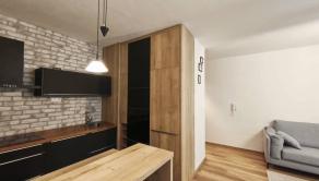 Interiér bytu vás očarí vkusným industriálnym štýlom – tehličkový obklad v kuchyni, čierne prvky a drevené detaily vytvárajú príjemnú atmosféru domova.
