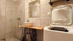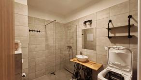 Obývačka ponúka pohodlnú rohovú sedačku, TV stolík a rustikálny konferenčný stolík – všetko dokonale zladené. Z obývačky vedie výstup na balkón